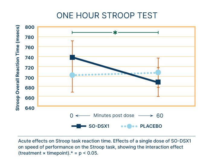 After one hour, results of Stroop tests were significant between the SO-DSX1® and placebo groups: from 740 milliseconds to 690 milliseconds in the supplement group, and from 700 milliseconds to 710 milliseconds in the placebo group.