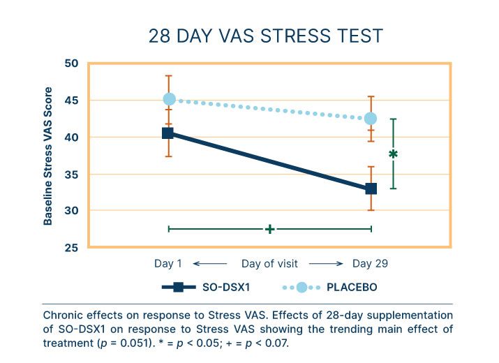 The self-reported stress scores of participants who received the SO-DSX1 treatment at the 28-day mark also significantly improved, compared to placebo, as measured by the Stress Visual Analog Score.